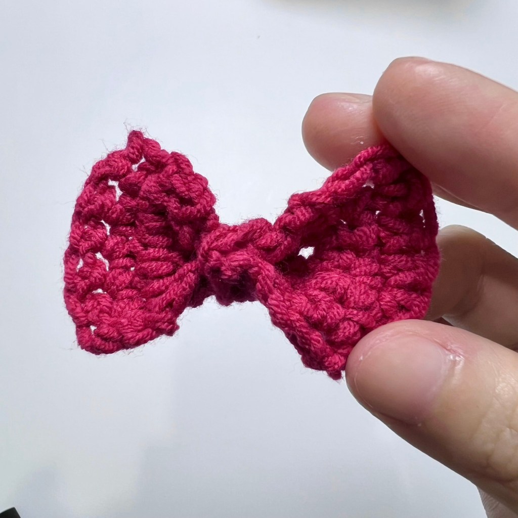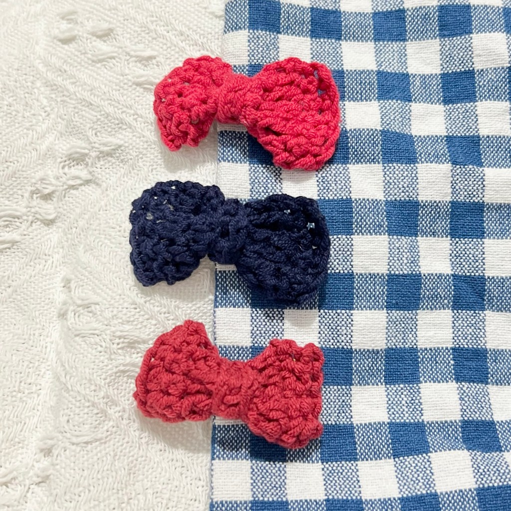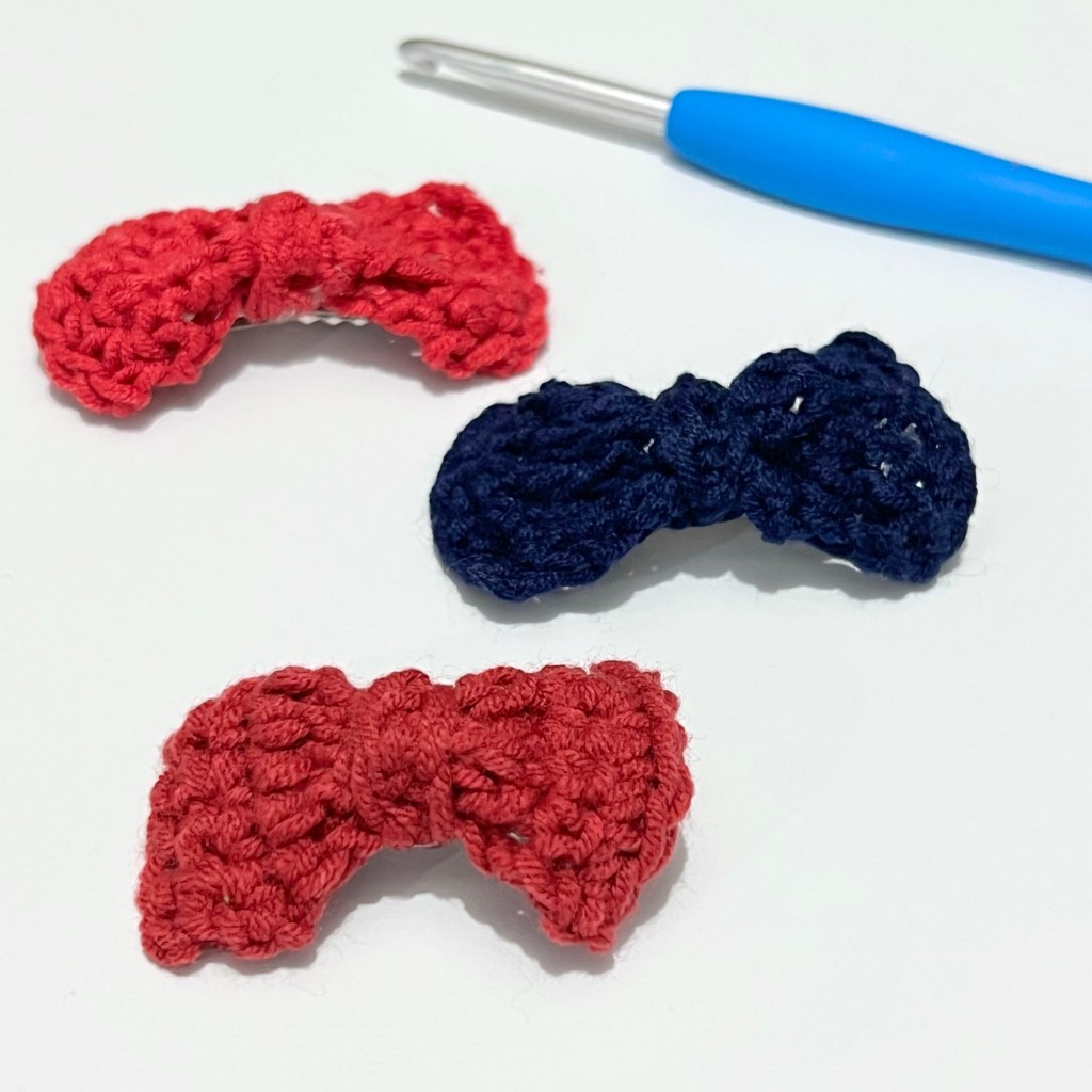And there you are, you have finished your mini bow hair clip! It’s pretty easy, right?! With the techniques used in this pattern, you can now make plenty of bows and use them in different projects. You may use different yarn to play with the color, size and texture.