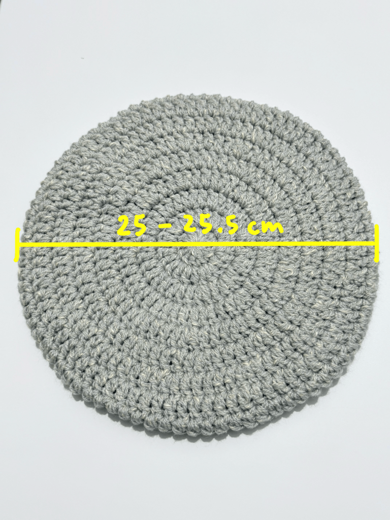 This pattern is worked with two strands so you may use either DK yarn (double strands) or worsted yarn (single strand) with corresponding crochet hook for substitution. As long as you have a diameter of around 23cm after finishing the 7th round, the beret will turn out in the desired size.