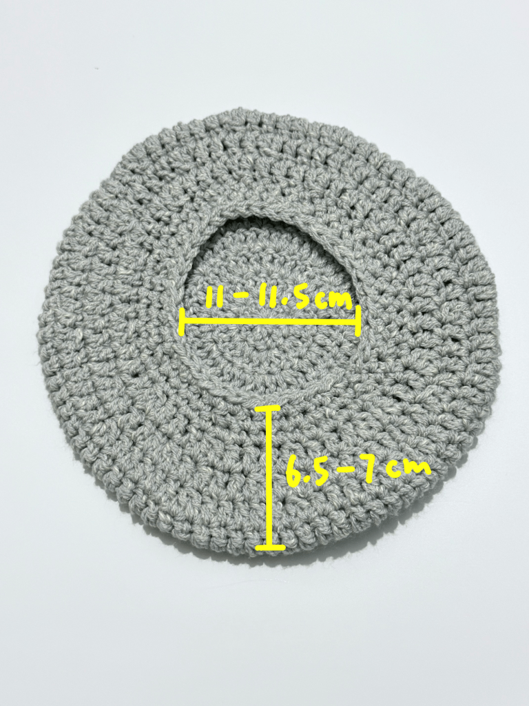 – Even the two berets I made vary in size slightly due to tension differences. However, there is no need to worry as long as your beret falls within the measurements listed in the photos below:
