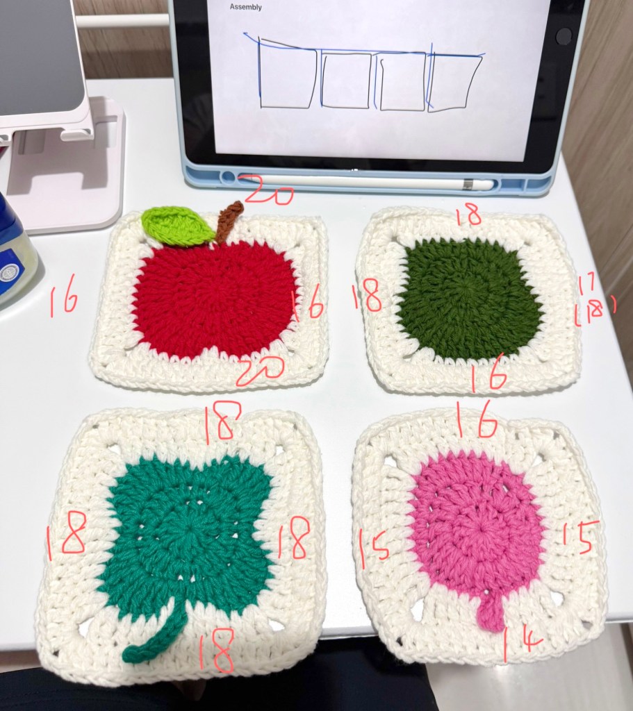You can take a closer look to all four granny squares in the above photo. This photo was taken and used when I was fine tuning the patterns. From top to bottom and left to right, we have an apple, a dinosaur head, a clover and a balloon. The inspiration is from a Korean character series called ‘Joguman’. I’m obsessed with the characters lately and wanted to crochet myself something that can reminds me of them, which led to the birth of this bucket hat design : )